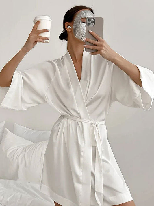 Robe de Chambre Satinée pour Femme | Manches Amples | Kimono Blanc