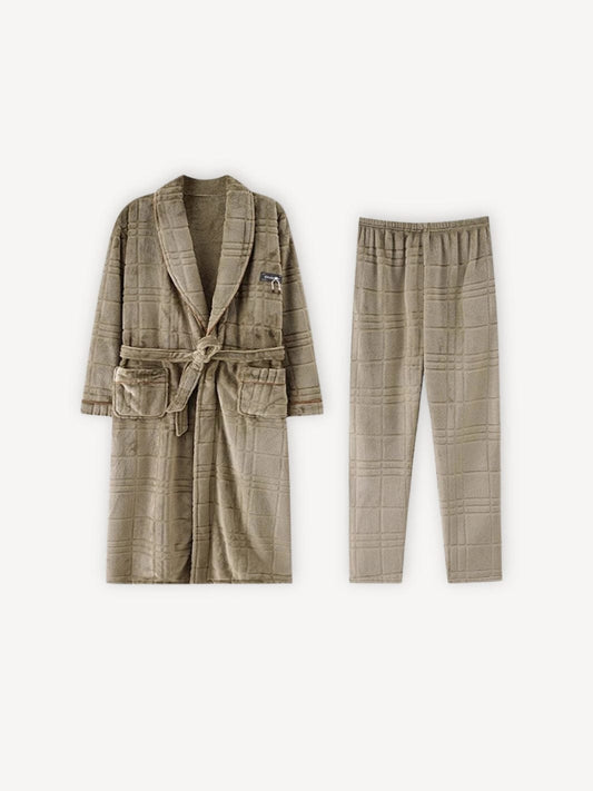 Les pyjamas homme hiver unis dans les tons marine, gris anthracite et bordeaux restent les choix privilégiés pour leur élégance discrète. Les versions à carreaux ou rayures apportent une touche britannique authentique, parfaite pour l'esprit hivernal.